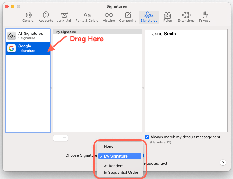 Træk signaturen til din e-mail-konto i venstre kolonne og vælg din signatur under “Vælg signatur.”